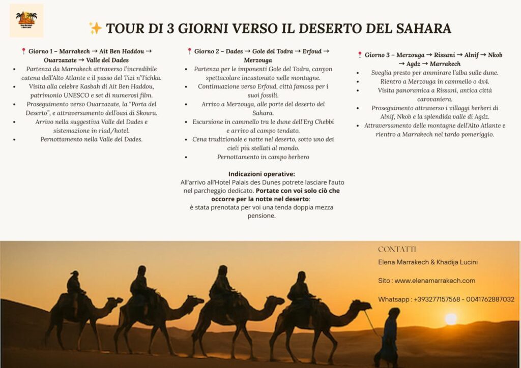 Le strade sono migliori di quanto pensassi. L’organizzazione di Elena e Khadija ha funzionato perfettamente — strutture puntuali, indicazioni chiare, supporto sempre disponibile. Il percorso da Marrakech a Merzouga e ritorno è un classico per ottime ragioni: paesaggi che cambiano ogni ora, dalla montagna al deserto, dai canyon alle oasi.